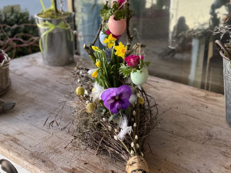 In diesem Workshop gestaltest du dein persönliches Osternest in Form eines dekorativen Ovals aus Zweigen. Dieses natürliche Grundgerüst wird anschließend mit frischen Frühlingsblühern bepflanzt und ganz nach deinem Geschmack mit liebevollen Osteraccessoires ausgeschmückt.
